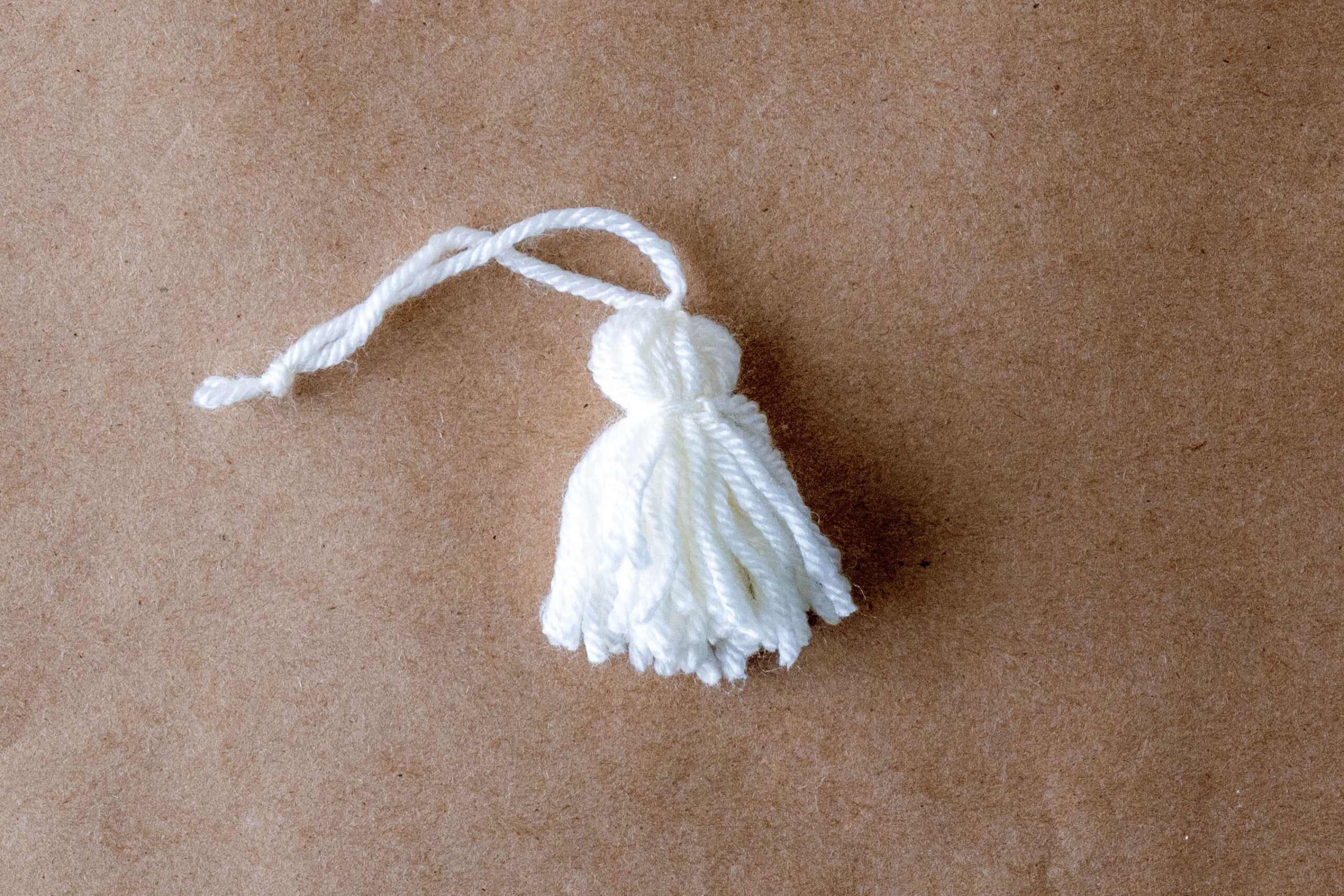 How to: Wrap yarn around a small piece of cardboard, tie a knot near the top, then cut the bottom loops. Gather the strands and tie another knot around the upper third to form the tassel.
