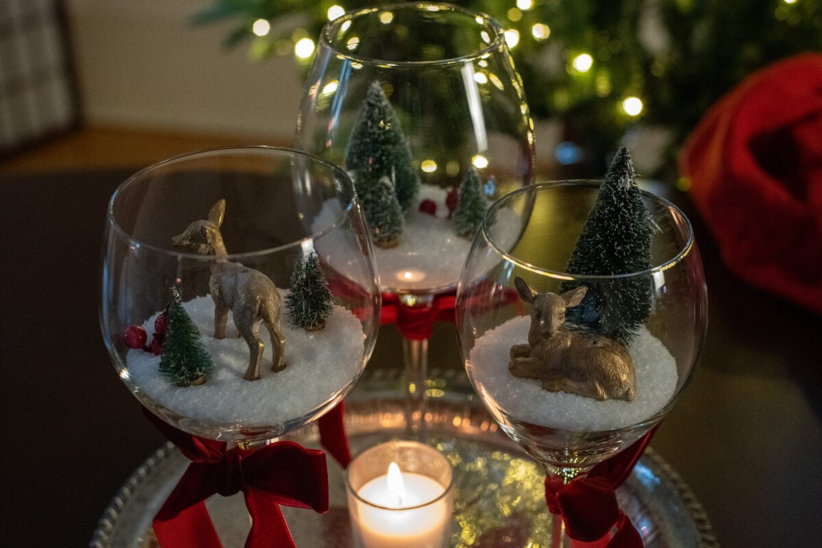 The idea is to find a few things that look somewhat cohesive together. Fake flowers or holly sprigs. Small Christmas ornaments. Tiny knick-knacks. Do you have a collection of Christmas pins? Put one in each wine glass. Even something as simple as twigs of fresh rosemary or evergreens. Arrange them in your snow. Add a votive candle to the middle of your tray if you have one. (Be mindful of your bows!)